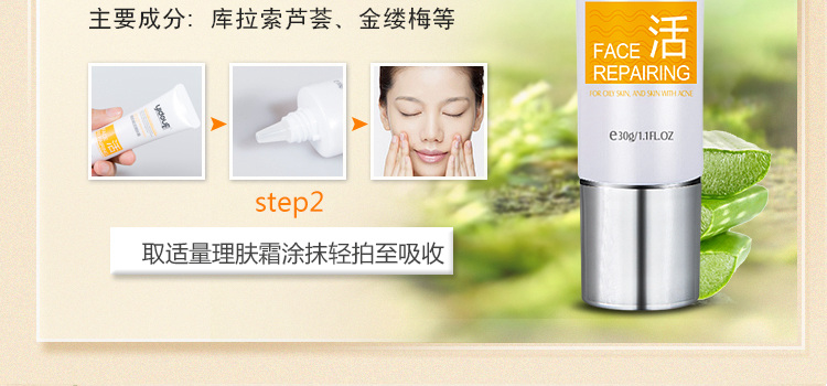 使用方法: 洁面爽肤后,取适量本品均匀地涂抹于脸部患处,轻柔按摩至吸收即可。配合祛痘产品并持续使用效果更佳。